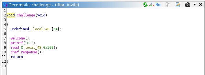 In Ghidra, the challenge function reads our input into a buffer with a clear overflow: