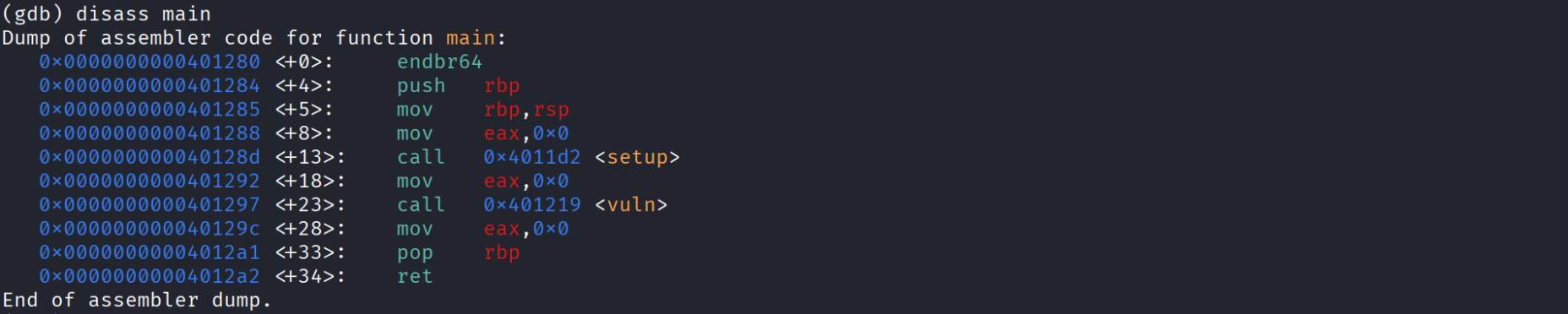 - the main calls vuln function , let’s see what happens in it by disassembling it aswell using disass vuln