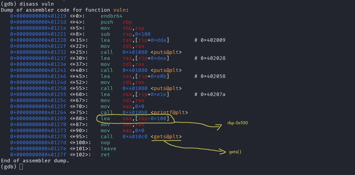 As we can see from the disassemblmy of vuln , the binary is using gets whic is a DANGEROUS function to read the input with because it dosen’t check the size of ur input and can lead to buffer overflows . Our input variable is located in rbp-0x100 meaning to reach rbp we need 0x100 and after rbp we have rip which is our target so to start writing in the rip we need : 0x100 + 8 = 0x108 bytes