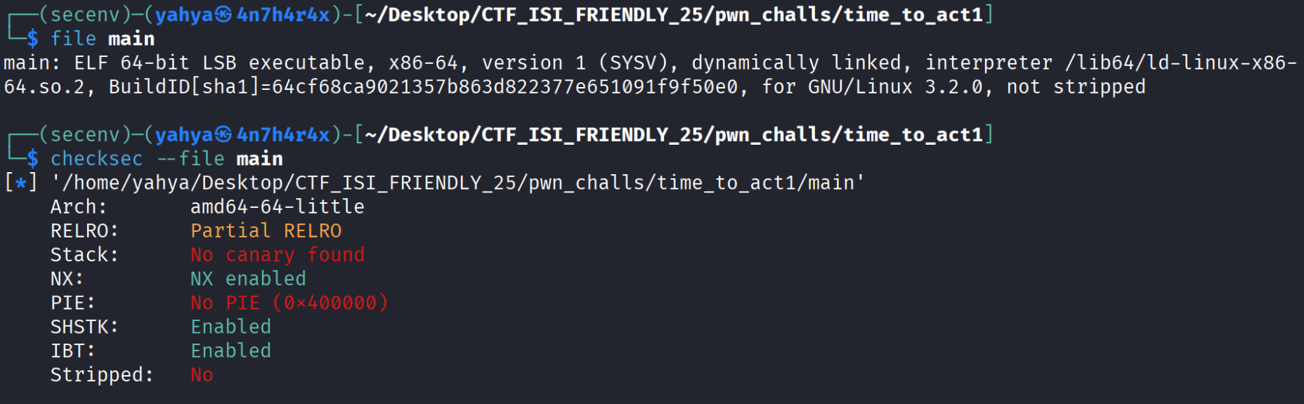 - Okay so we were given an elf binary called main , we simply analyse it using file and checksec command file ./main then checksec –file ./main