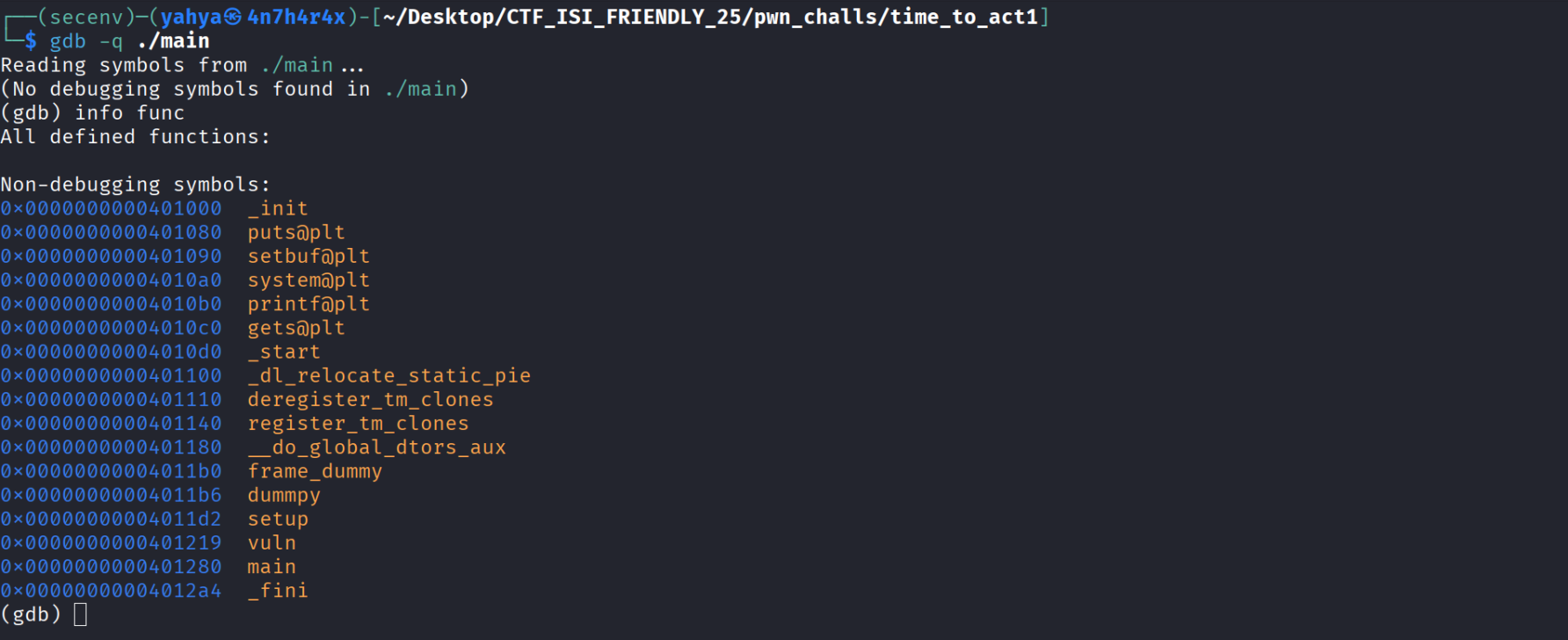 I will now use gdb to see what functions this binary have and calculate the offset to rip , i executed gdb -q ./main to debug it ( the -q means quiet and less output in intro ) then i typed ‘info func’ which will show us the available functions and their addresses , we can definetly return and use any function we want amoung these ! ( atht’s what will happen lol)