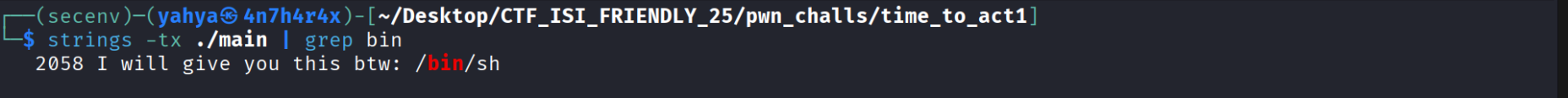Remember the string we got when we first ran the binary ? : “I will give you this btw: /bin/sh” In a nutshell we need to call system and pass /bin/sh , we have the address to system which is 0x4010a0 that we got earlier from gdb and seeing the available functions now we need to figure out where is /bin/sh and how to get its address. There are many tools like strings readelf objdump that allow you to search for strings/texts - inside the binary , the i used and worked for me was strings -tx ./main and since we are only intrested in /bin/sh i finally executed : strings -tx ./main | grep bin