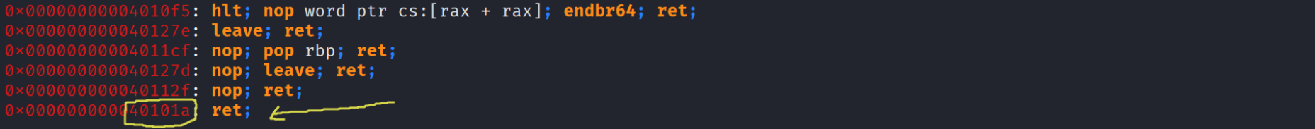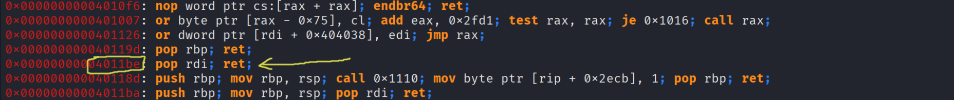 Now before starting to write our script we just need to get some gadgets that’ll help us set the - right arguments in our case the first argument which is represented by the register rdi in the System V AMD64 ABI x86_64 , and gadgets are simply a set of instructions that ends with a ret , we use the tool ropper to see the available gadgets in our binary , m gonna execute ropper –file ./main it produce a long output but we are only intrested in pop rdi ret and ret in case there’s an alignement issue