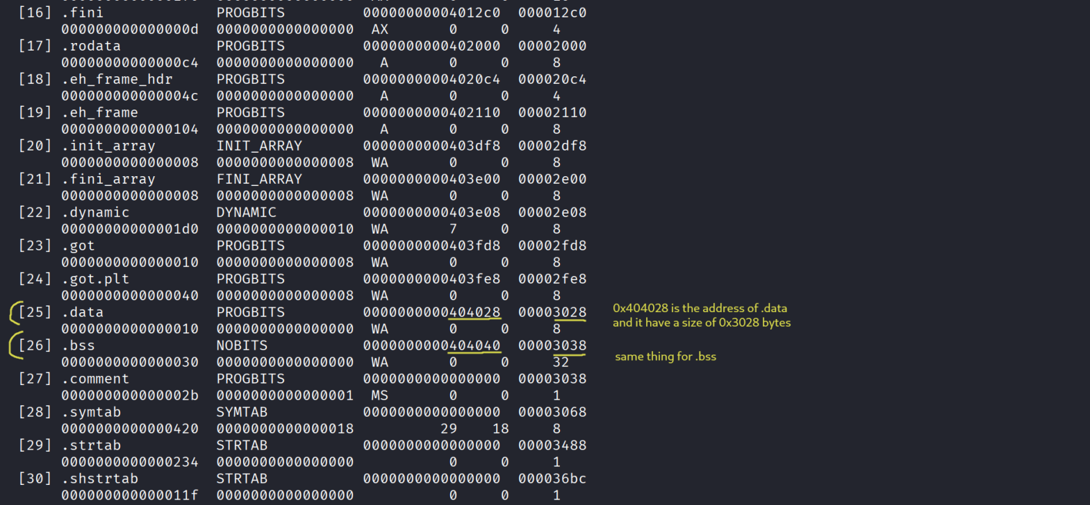 - So when RELRO is partial we can write somewhere in the binary whatever we need wether it’s a shellcode or a rop chain or even a simple string like “/bin/sh” usually in .data or .bss sections , let’s see their addresses and if they have enough space or no ( > 7 bytes ) , we can see the elf sections with this command : readelf -S ./main :