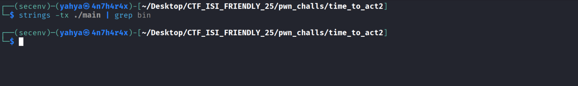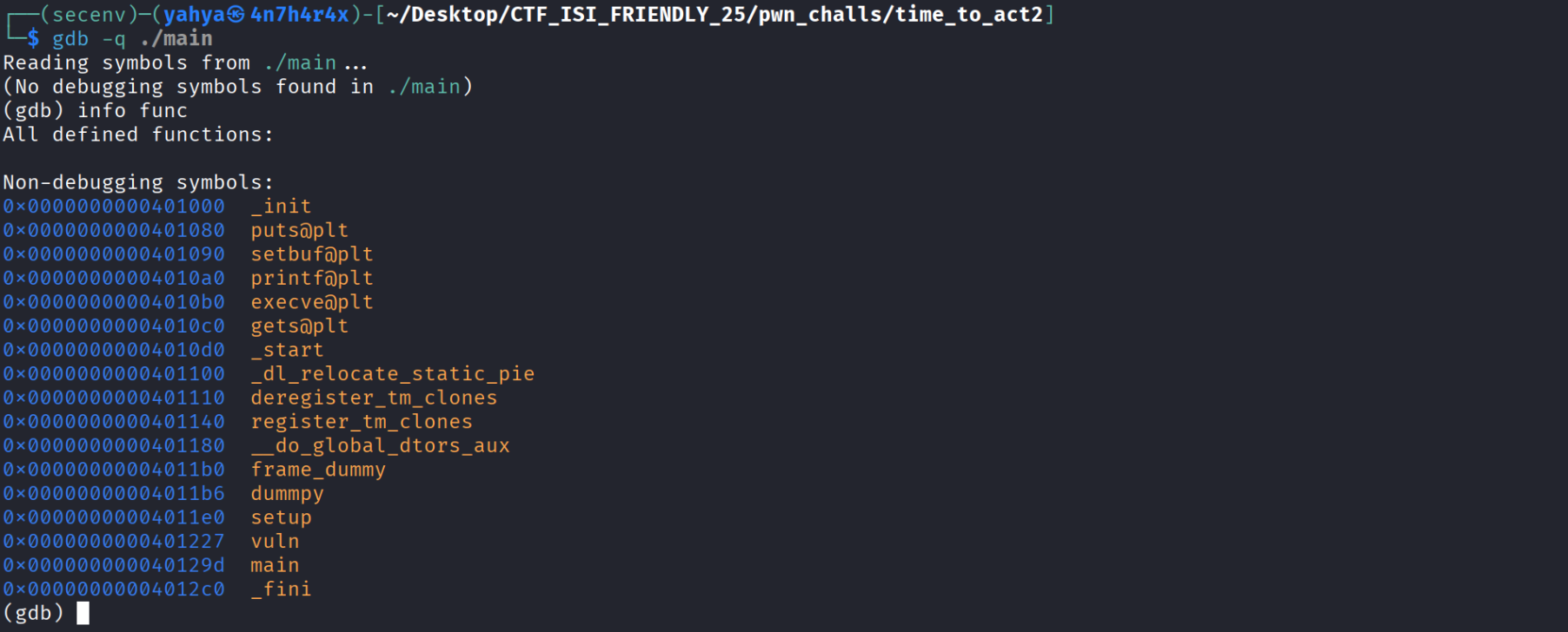 - This challenge is exactly the same as the previous one ( time to act 1 ) with a small twist , instead of system we have execve and we don’t directly have the string /bin/sh , and to spawn a shell using execve we need to call it like that execve(“/bin/sh” , 0 , 0); so we need to set up the arguments using rdi = “/bin/sh” (we’ll talk how to get it) , both rsi and rdi = 0 , don’t understand why these registers specifically ? do a bit of research about System V AMD64 ABI x86_64 , i will extract the gadgets as follows , i always keep a ret gadget in case of a misalignment issue to align the stack :