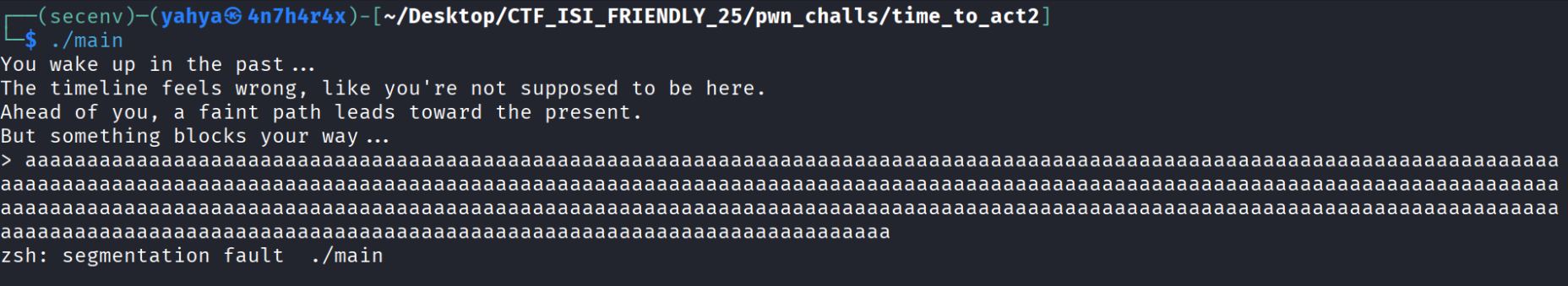 - RELRO is partial which means we can overwrite some regions of the binary with whatever we want and this will be very helpful and make a lot of thing easier for us, and when i execute the binary this is what it outputs :